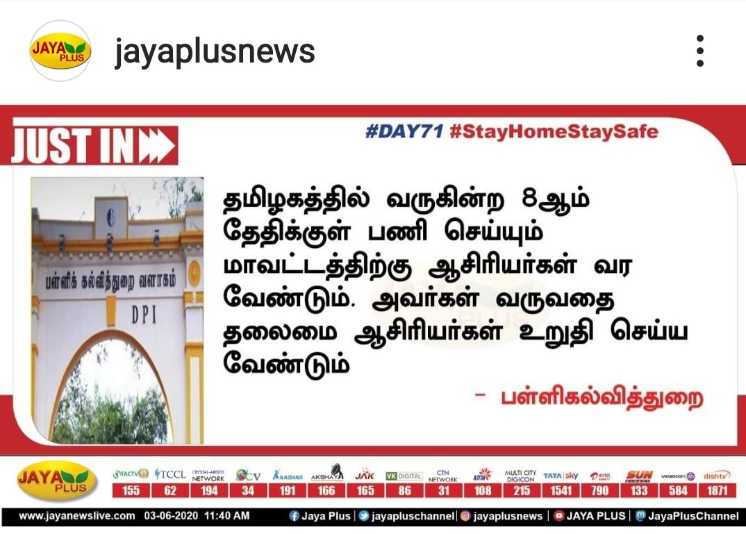 _▪️தமிழகத்தில் வரும் 8ம் தேதிக்குள் பணி செய்யும் மாவட்டத்திற்கு ஆசிரியர்கள் வர பள்ளிக்கல்வித்துறை உத்தரவிட்டுள்ளது. கடந்த மார்ச் 24ம் தேதியுடன் பிளஸ் 2 தேர்வுகள் முடிந்த நிலையில் பிளஸ் 1 தேர்வுகள் மார்ச் 26ம் தேதி முடிய இருந்தன. ஆனால், கொரோனா வைரஸ் பாதிப்பு காரணமாக பிறப்பிக்கப்பட்ட ஊரடங்கு நீட்டிக்கப்பட்டது. இதனால். பிளஸ் 2 தேர்வு விடைத்தாள் திருத்தும் பணி, பிளஸ் 1 தேர்வு ஒன்று, 10-ம் பத்தாம் வகுப்பு பொதுத்தேர்வு என ஏற்கனவே திட்டமிடப்பட்டிருந்த கால அட்டவணைப்படி எதுவும் நடத்த முடியாமல் போனது._
