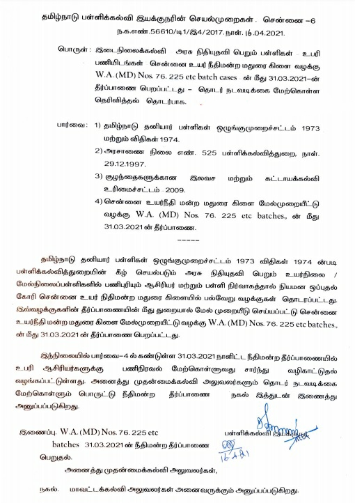 தமிழ்நாடு தனியார் பள்ளிகள் ஒழுங்குமுறை சட்டம் 1973 விதிகள் 1974 இன் படி பள்ளிக் கல்வித்துறையின் கீழ் செயல்படும் அரசு நிதியுதவி பெறும் உயர்நிலை மேல்நிலைப்பள்ளிகளில் பணிபுரியும் ஆசிரியர் மற்றும் பள்ளி நிர்வாகத்தால் நியமனம் கோரி சென்னை உயர் நீதிமன்ற மதுரை கிளையில் பல்வேறு வழக்குகள் தொடரப்பட்டது இவ்வழக்கின் தீர்ப்பை எதிர்த்து மேல்முறையீடு செய்யப்பட்டு சென்னை உயர் நீதிமன்ற மதுரைக் கிளை மேல்முறையீட்டு வழக்கு தீர்ப்பு இந்நிலையில் பார்வை நாளின் கண்டுள்ள 31-03-2021 நாளிட்ட நீதிமன்ற தீர்ப்பை உபரி ஆசிரியர்களுக்கு பணிநிரவல் மேற்கொள்வது சார்ந்து வழிகாட்டுதல் வழங்கப்பட்டுள்ளது அனைத்து முதன்மை கல்வி அலுவலர்களுக்கும் தொடர் நடவடிக்கை மேற்கொள்ளும் பொருட்டு நீதிமன்ற தீர்ப்பின் நகல் இத்துடன் இணைத்து அனுப்பப்படுகிறது.