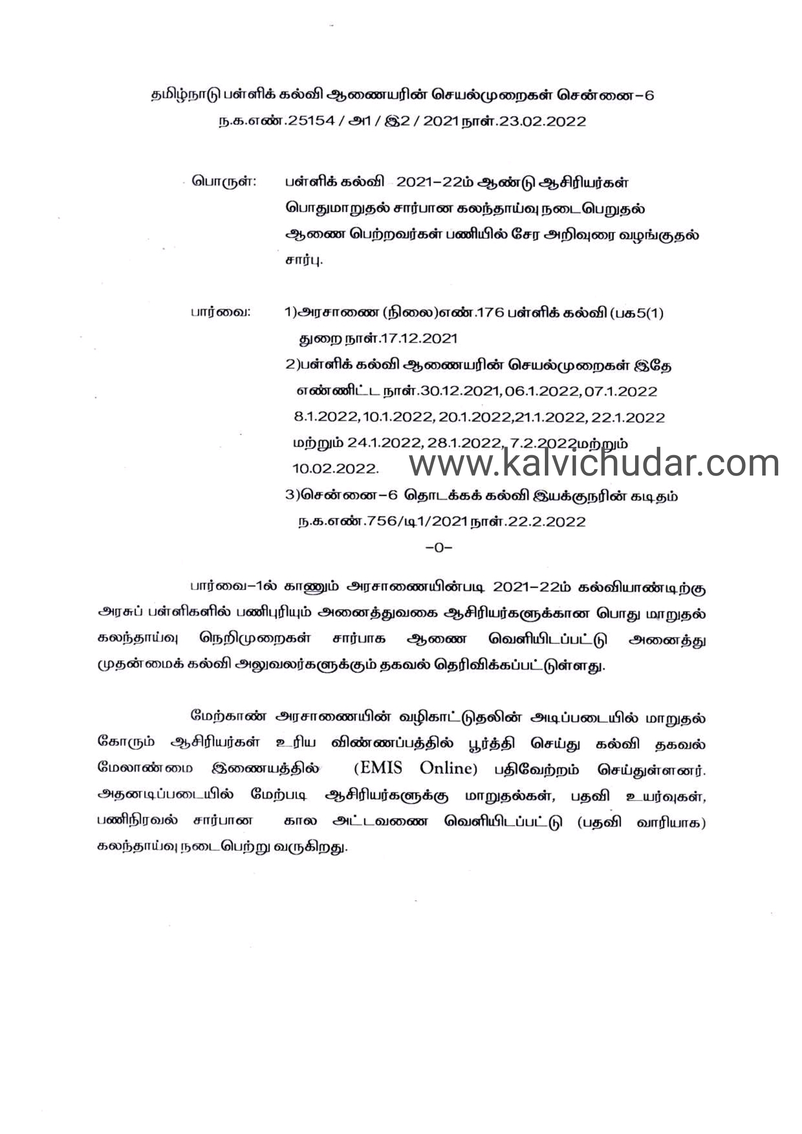 பொது மாறுதல் பெற்ற அனைத்து வகை ஆசிரியர்களும் 28.2.2022 பணிவிடுவிப்பு செய்து 01.3.2022 பணியில் சேர பள்ளிக் கல்வி ஆணையர் செயல்முறைகள்